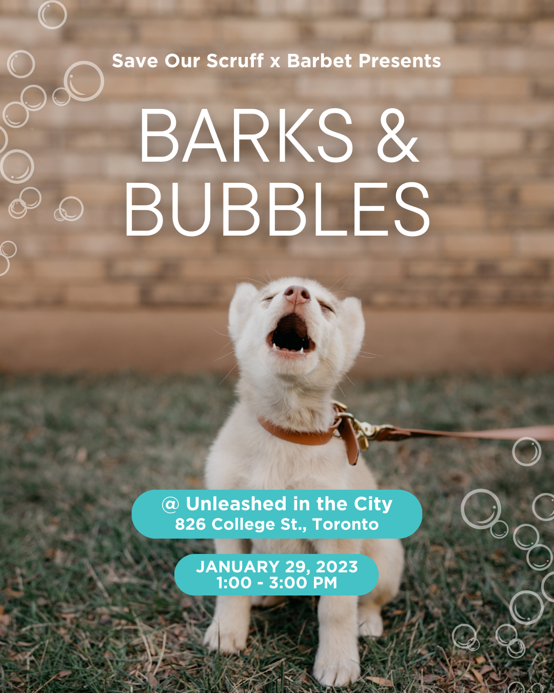 Join us for an afternoon of tasty drinks and adorable pups! Meet some adoptables and learn about how you can help Save Our Scruff in 2023! Plus, we've partnered with Barbet to provide some delicious sparkling waters while you mingle.