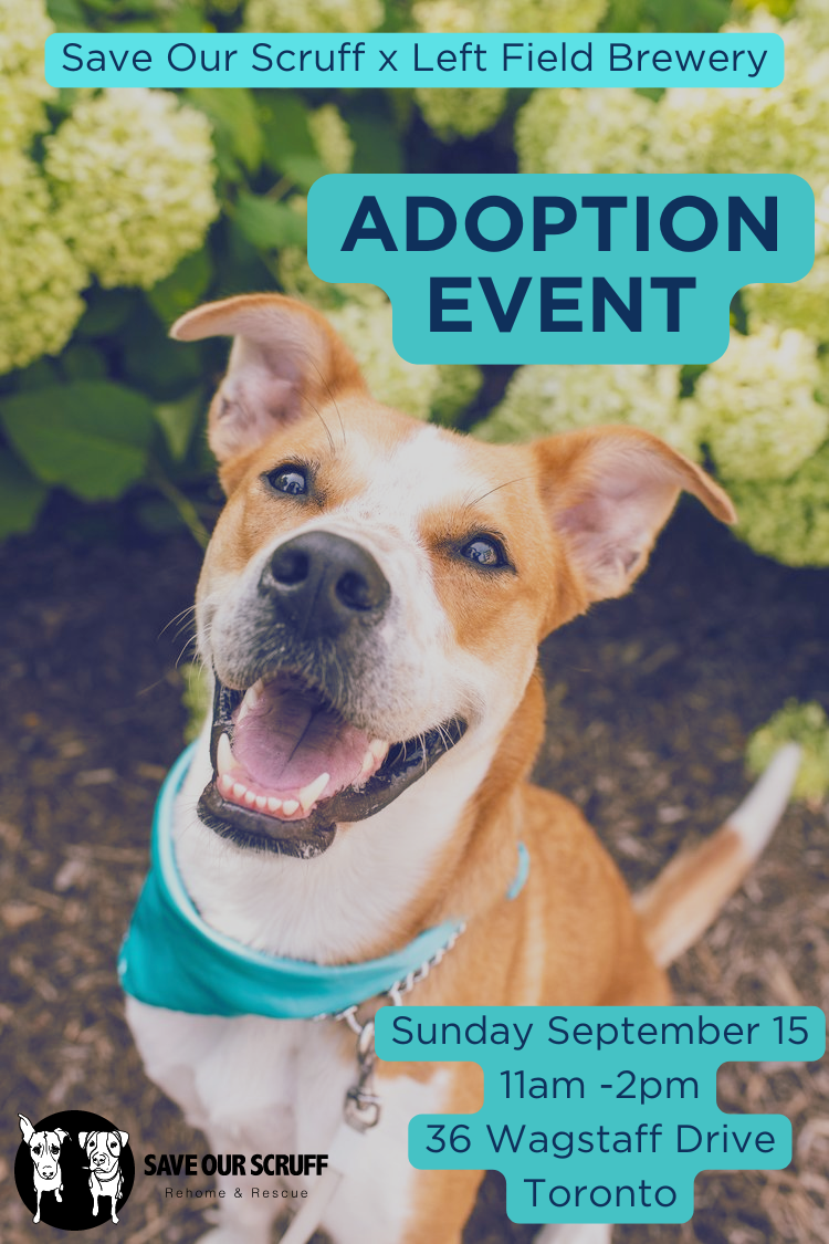 Title: September Adoption Event Date: Sunday September 15, 2024 Time: 11-2:00pm Location: Left Field Brewery (Leslieville) 36 Wagstaff Dr, Toronto, ON M4L 3W9 (map)