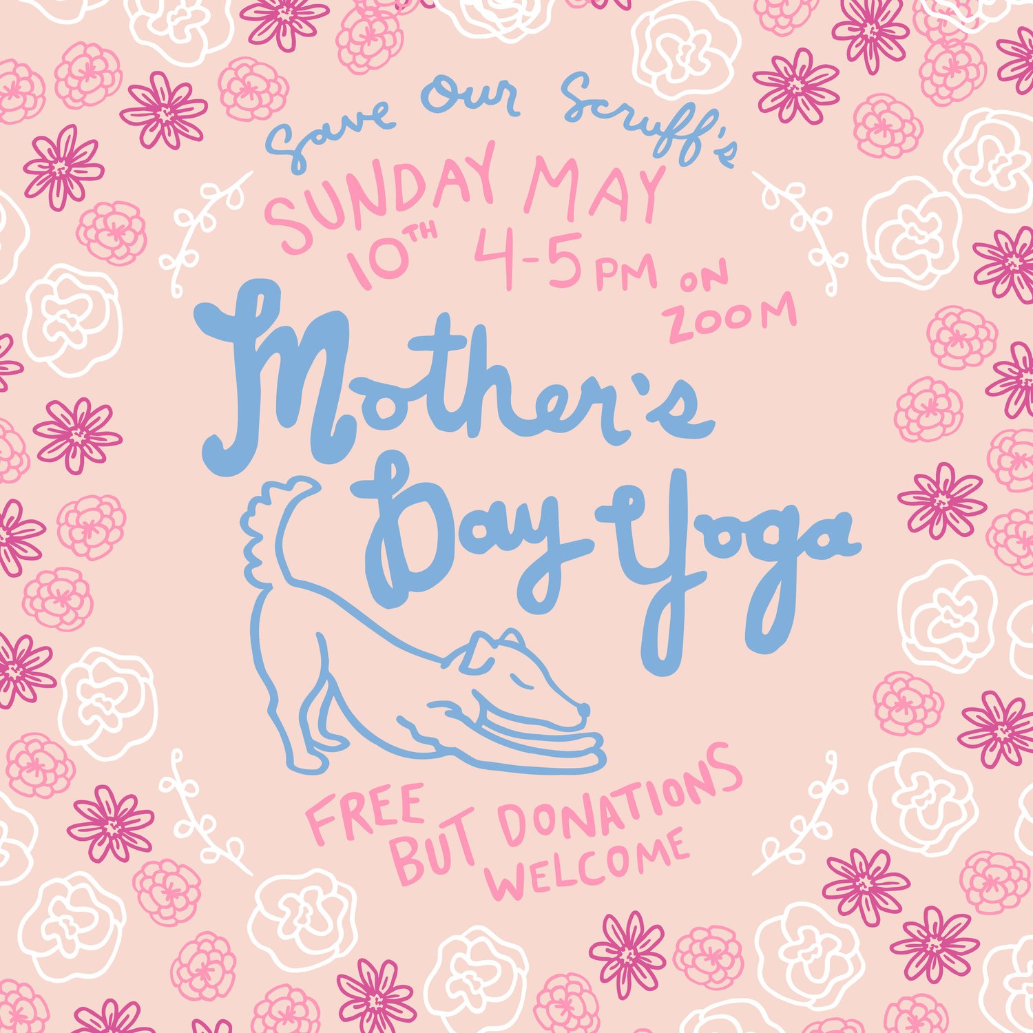 We are offering this class for free, however donations to Save Our Scruff are always welcome so that we can continue saving more dog momma's! When donating please be sure to note "Mother's Day Yoga" in the additional info section, in order to secure an entry for an SOS Yoga Tank.